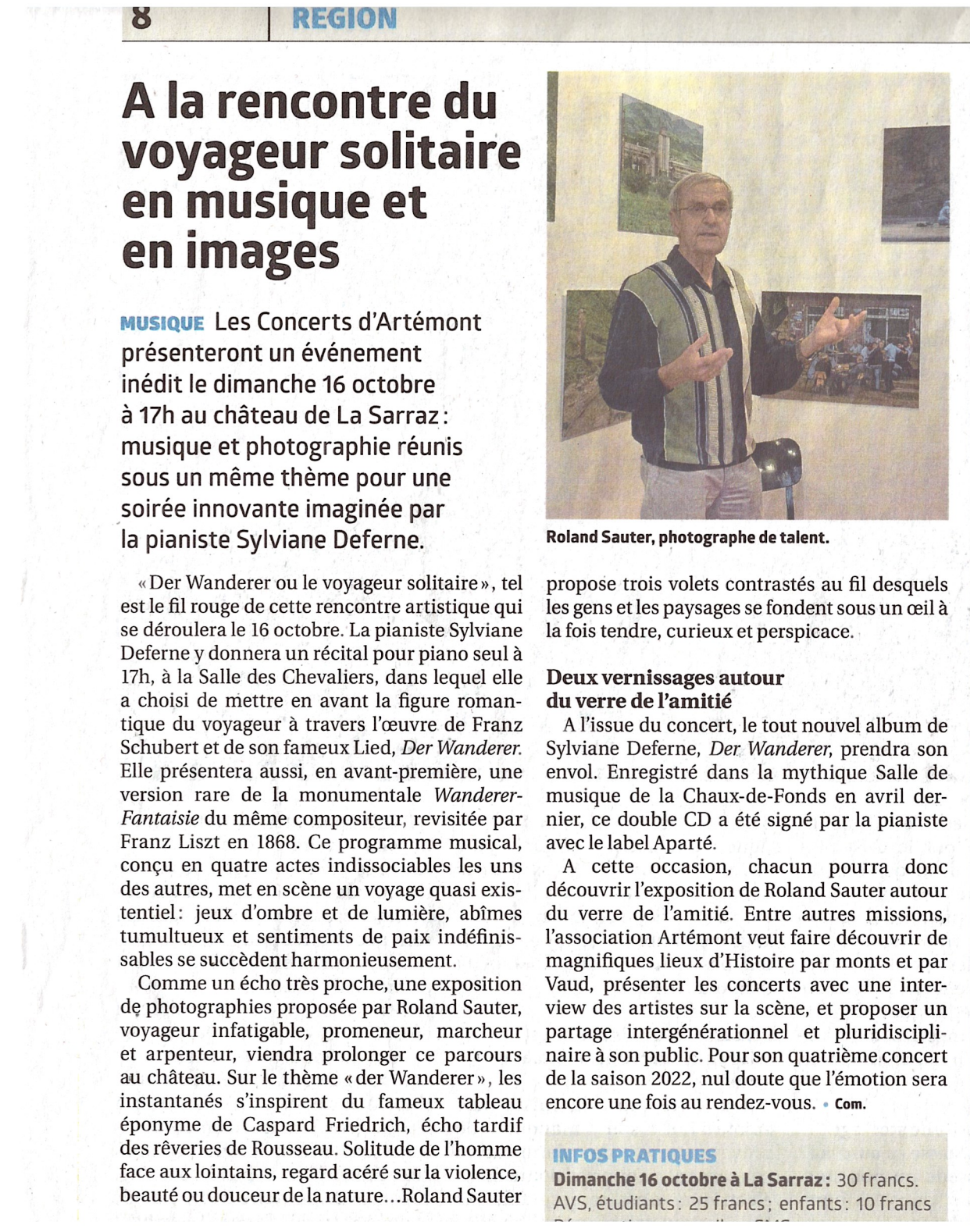 Les Concerts d’Artémont proposent un événement inédit mêlant musique et photographie, le dimanche 16 octobre à 17h au château de La Sarraz. Intitulée Der Wanderer – Le voyageur solitaire, cette soirée originale réunit la pianiste Sylviane Deferne et le photographe Roland Sauter autour d’un même fil conducteur : le voyage intérieur.