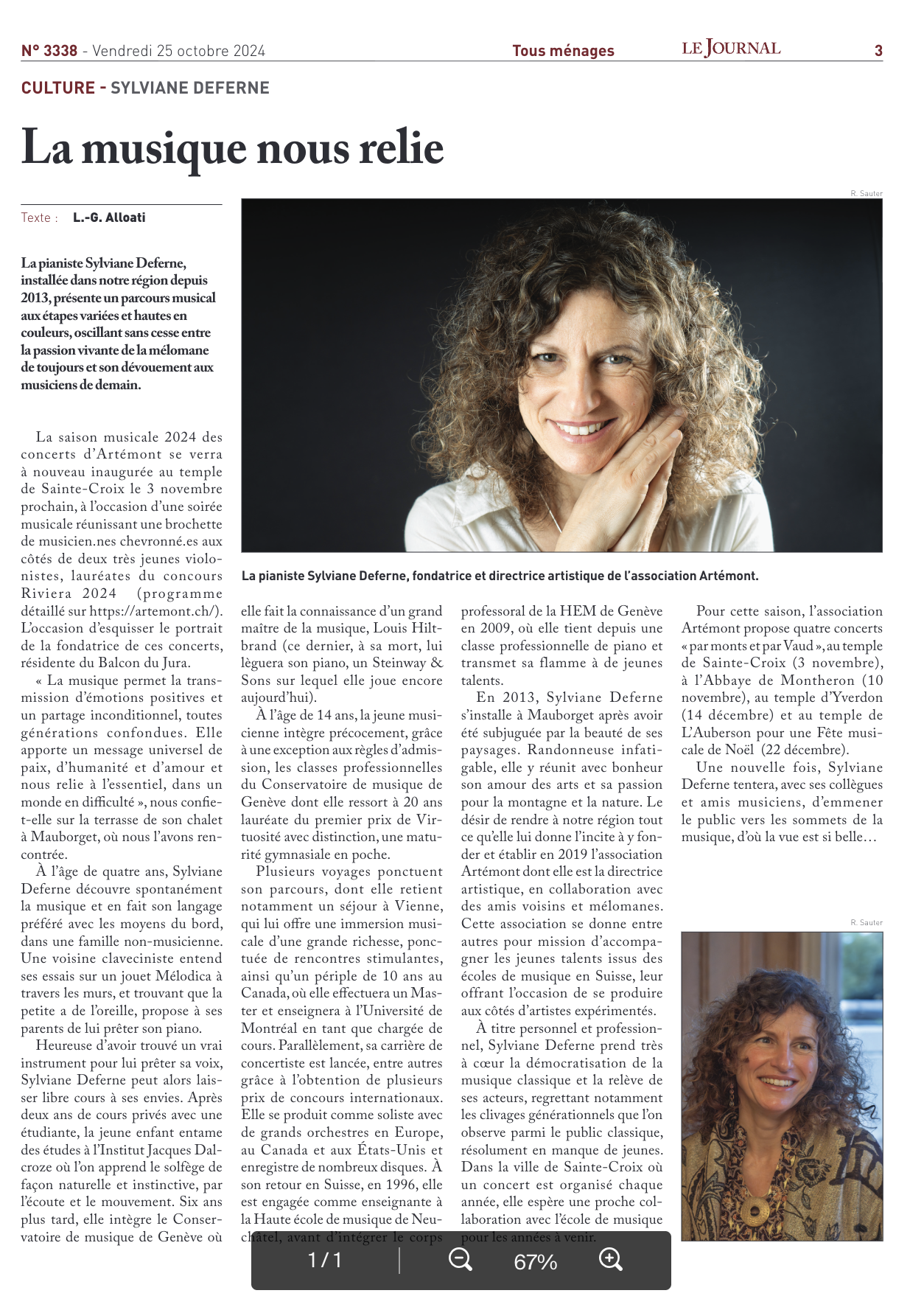 À travers ses saisons musicales, l’association propose une programmation exigeante et ouverte, attentive à la diversité des répertoires et à la démocratisation de la musique classique. Sylviane Deferne y défend une vision inclusive, attentive aux publics et soucieuse de renouveler le lien entre la musique et la société.