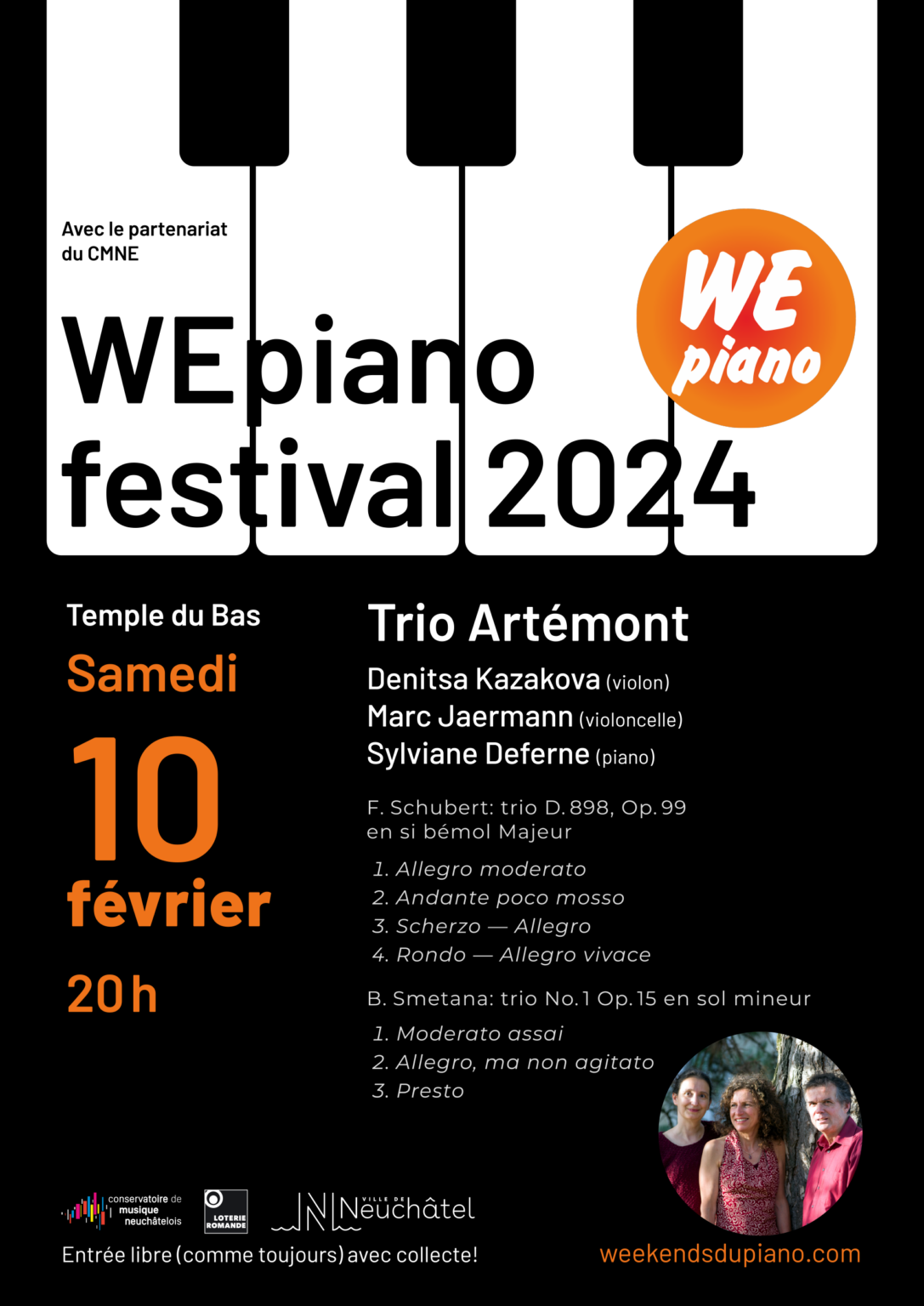 Pour bien débuter cette nouvelle année, que nous vous souhaitons à la fois paisible et pétillante, le trio Artémont se produira le 10 février prochain à 20h au Temple du Bas de Neuchâtel dans le cadre du Festival WEpiano 2024.