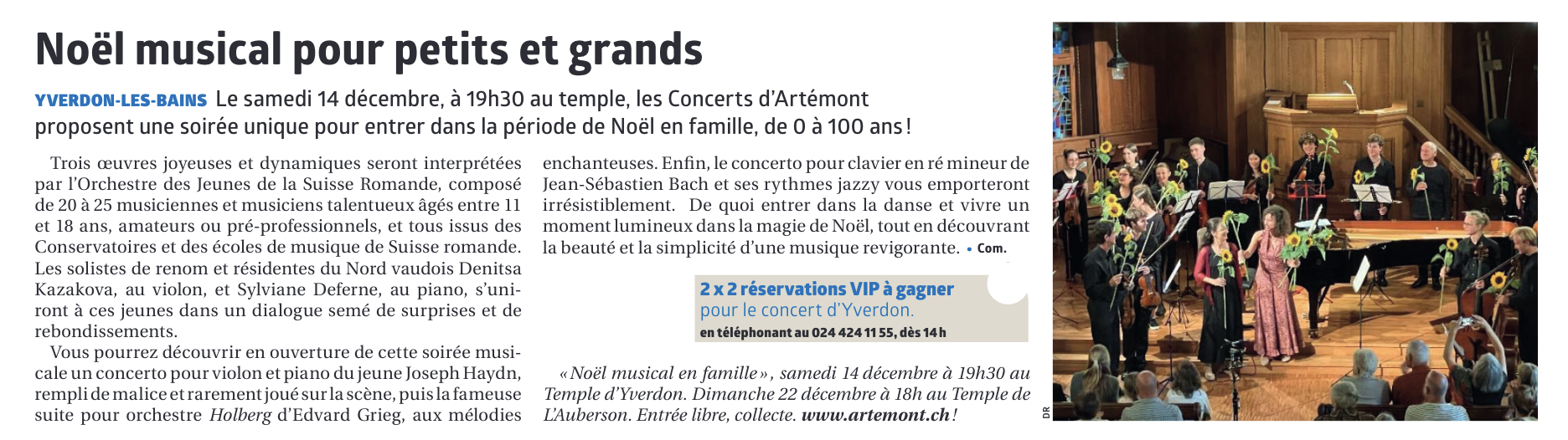 Les Concerts d’Artémont invitent le public à entrer dans la magie de Noël avec une soirée musicale pensée pour toute la famille, le samedi 14 décembre à 19h30 au Temple d’Yverdon. Un rendez-vous festif et intergénérationnel, ouvert aux petits comme aux grands, de 0 à 100 ans.